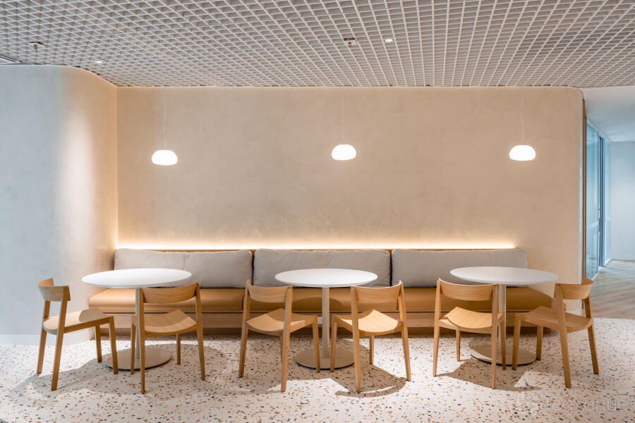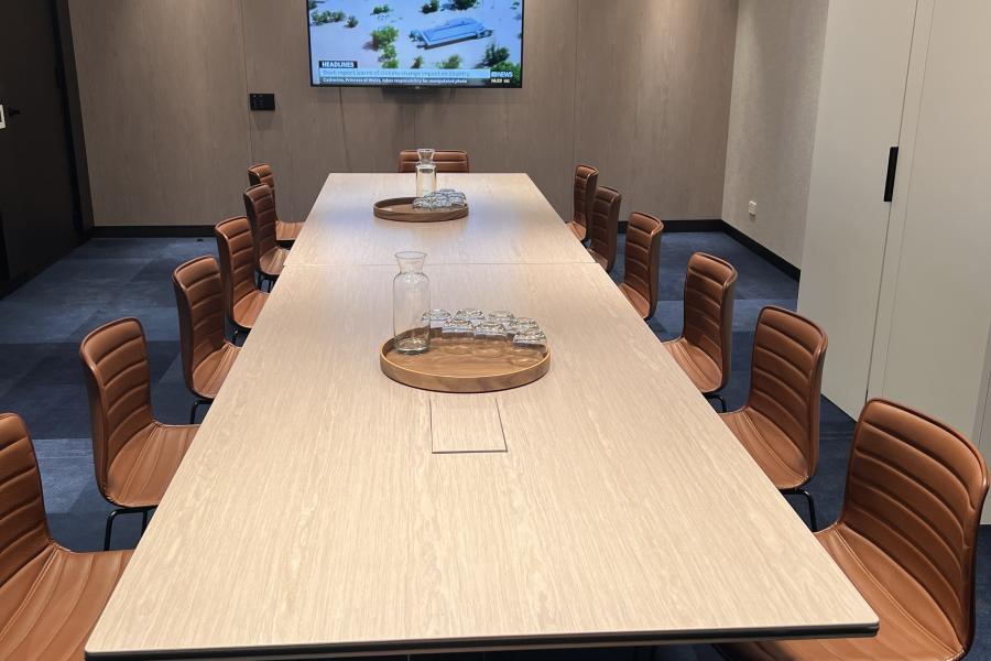 8-person external private office with city views. Serviced kitchen with amenities including tea, coffee and fruit. Location at 100 Arthur Street, North Sydney.