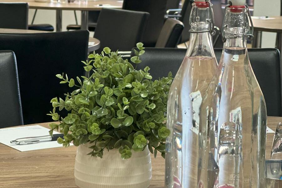 Water and Mentos mints on tables in conference room