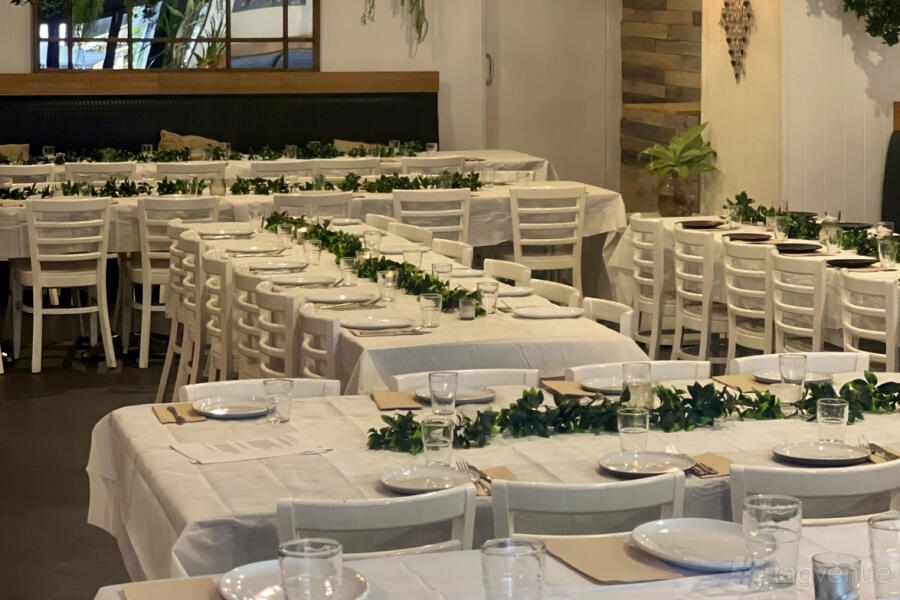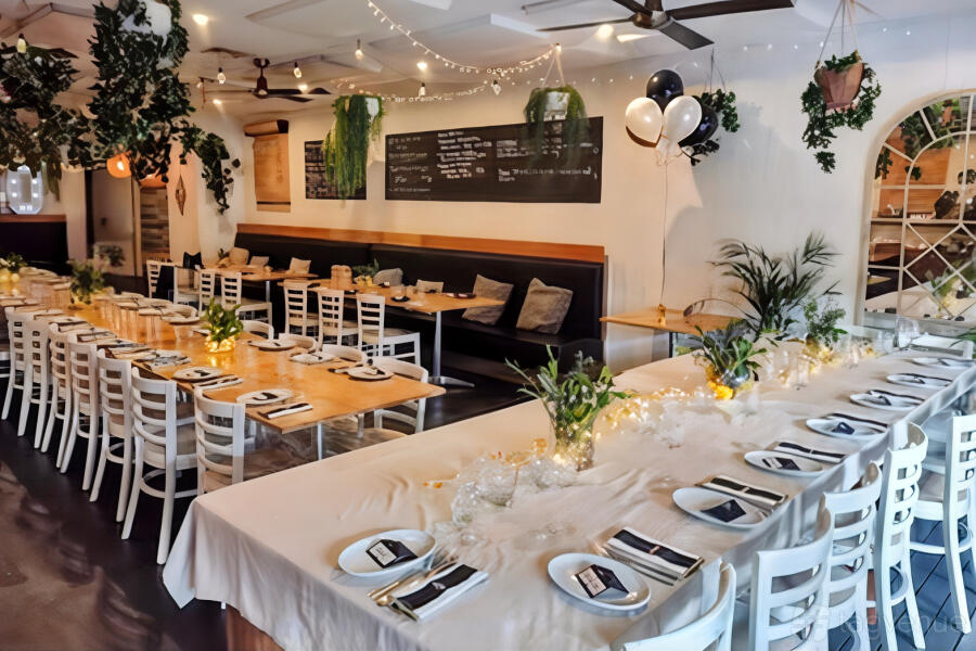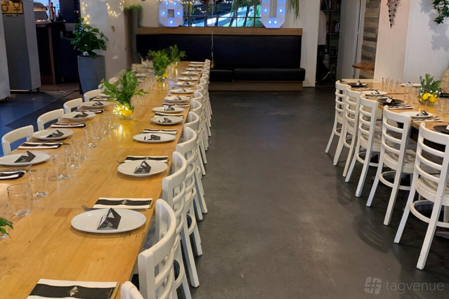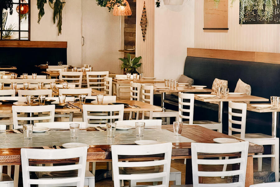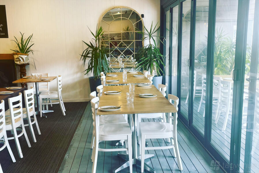 The outdoor dining area has a mix of high-top tables and standard seating, all beautifully set with neutral decor that complements the coastal vibe of Terrigal. The relaxed atmosphere invites guests to enjoy drinks, share plates, and pizzas while taking in the fresh air. Whether it's a casual brunch or an evening event, the outdoor space provides a versatile backdrop for all kinds of gatherings.