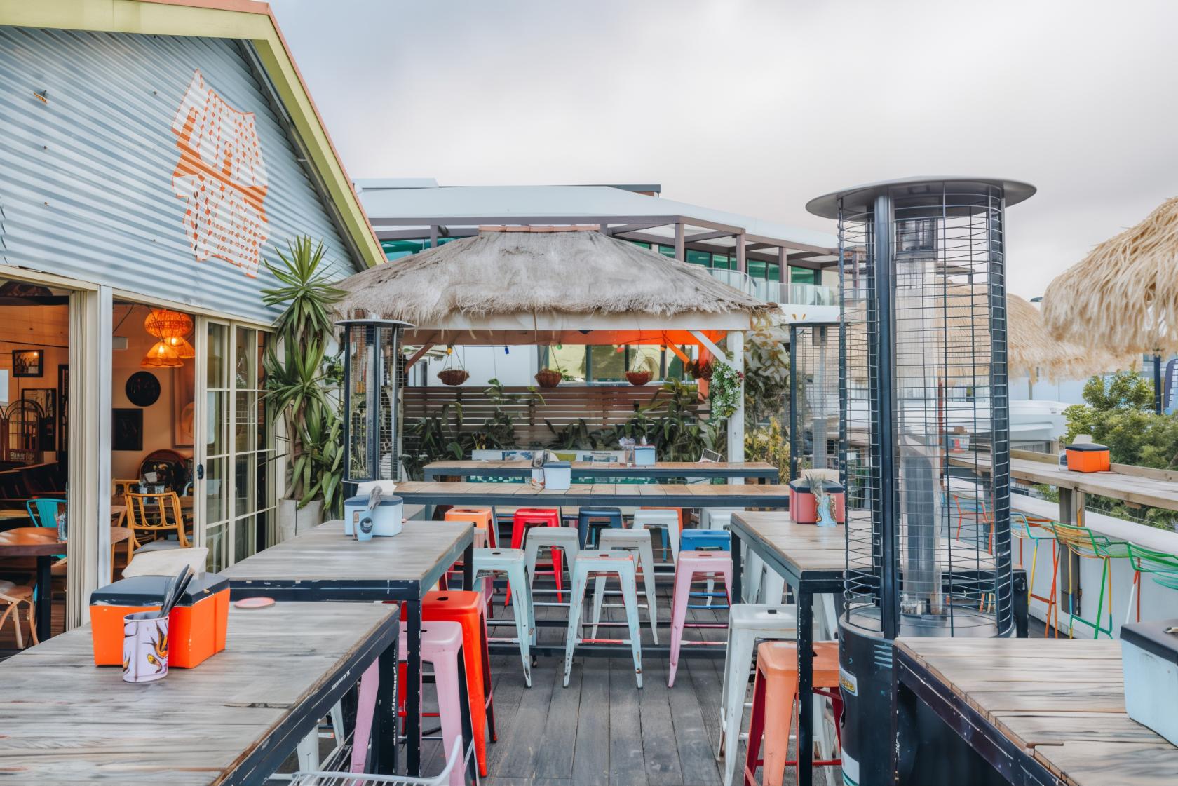 The Front Deck at Mumbo Jumbo’s Beachhouse boasts a relaxed, open-air setting with views overlooking the vibrant Terrigal Esplanade. Featuring thatched-roof accents, colorful stools, and rustic wooden tables, this space combines coastal charm with a laid-back, tropical vibe.