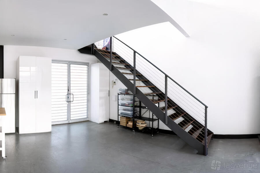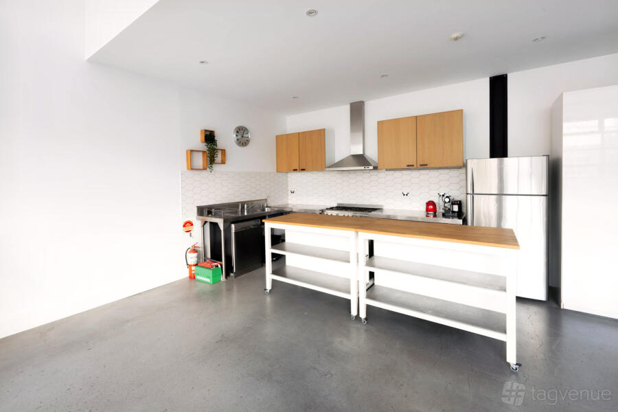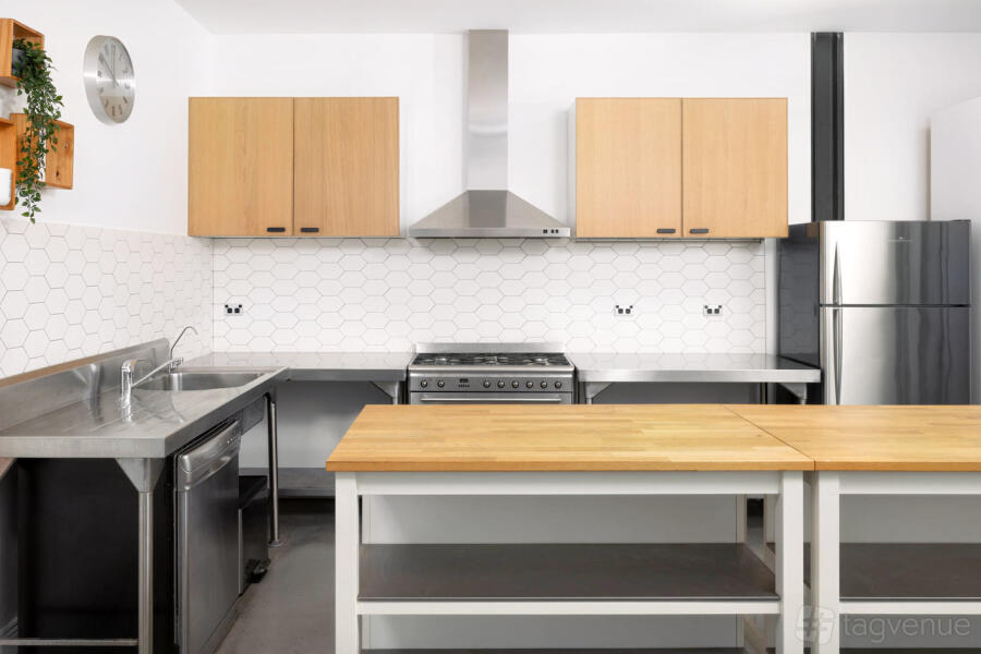 The studio has a modern stainless steel kitchen suitable for food photographers. Booking includes a still-life camera stand, c-stands, lighting stands, x2 Godox Pro Strobes, modifiers, hair+makeup stand, steamer, and more. One undercover parking spot next to a loading bay and commercial lifts. Plenty of free street parking. On-site cafe.