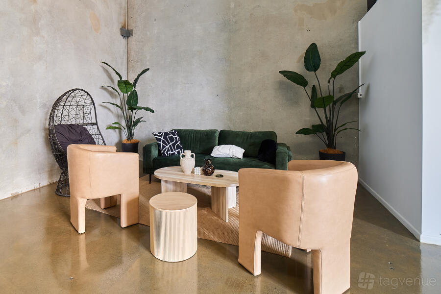 Modern industrial, reflective sealed cement floors and bare concrete walls. Raw design elements combined with luxe furniture in our client hangout area.