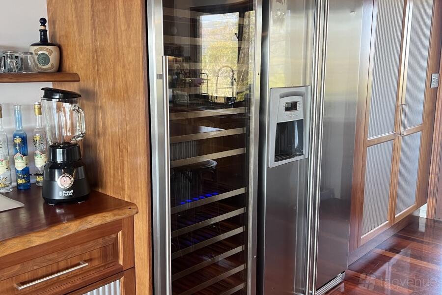 There are two bathrooms, both lacking a bath. The property boasts a pool, and the kitchen is equipped with a fridge/freezer, wine fridge, microwave, and oven, along with provided kitchenware and utensils.