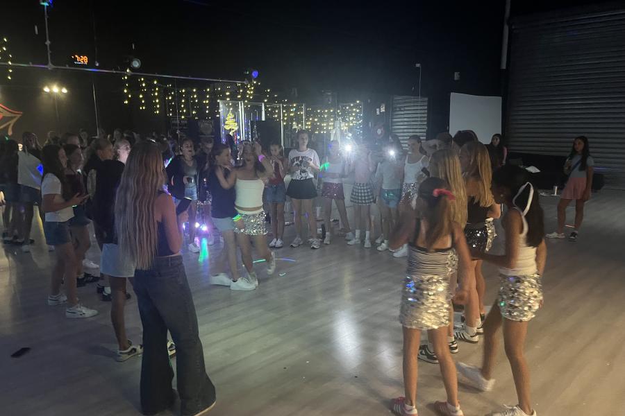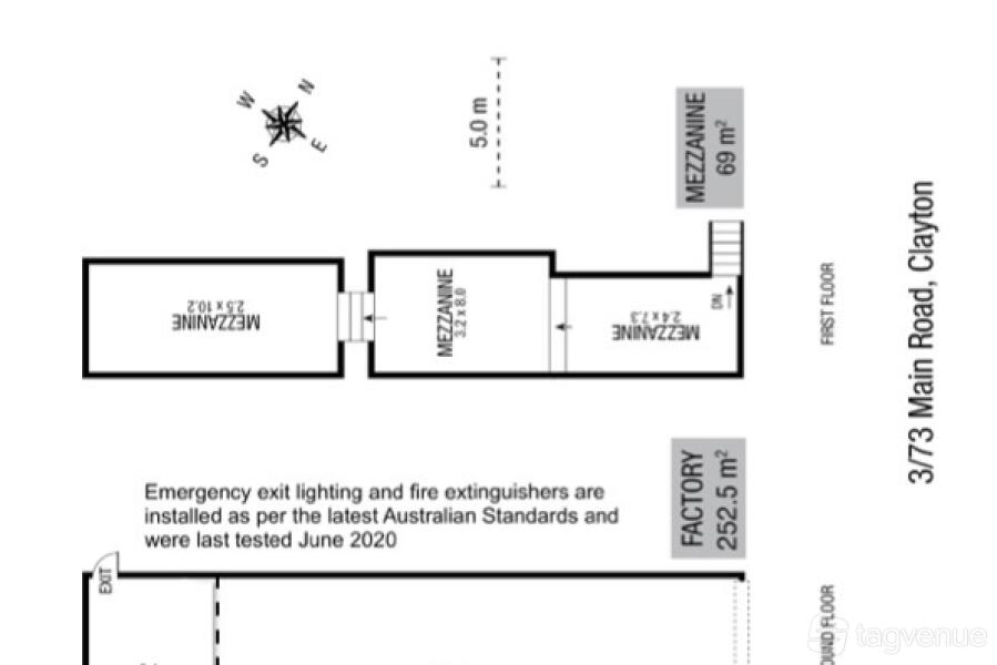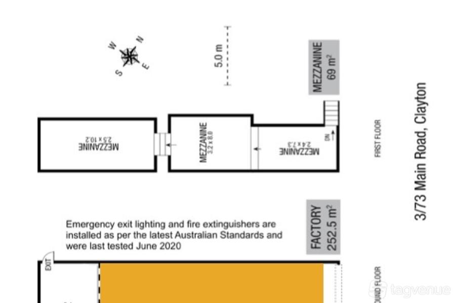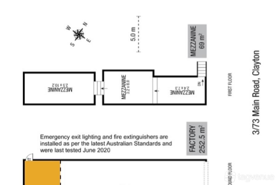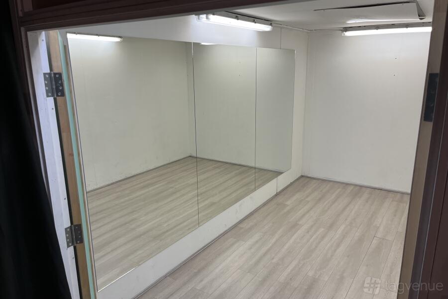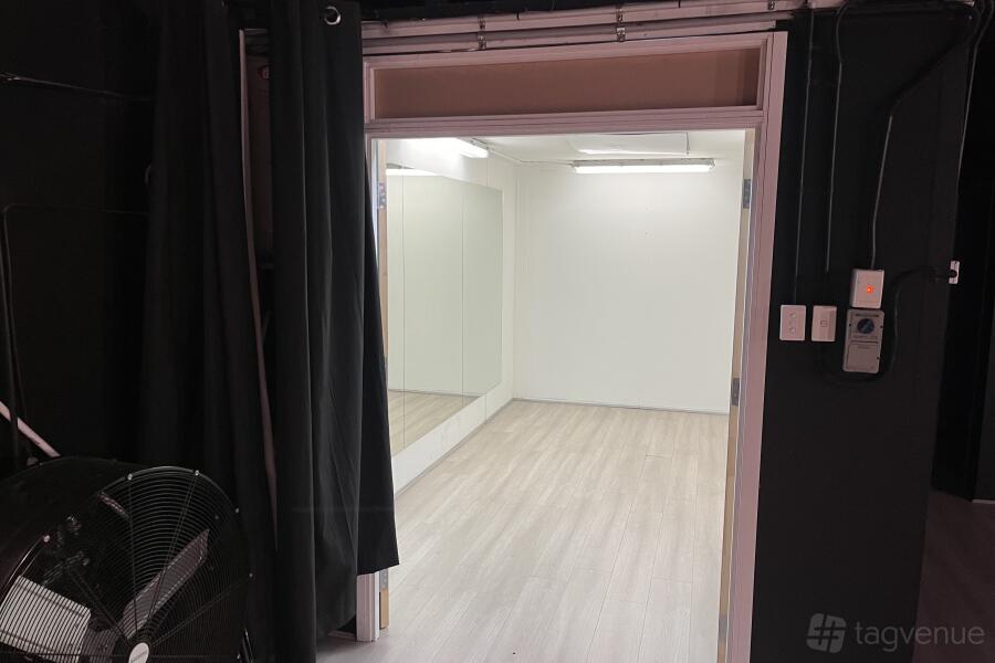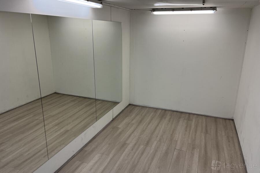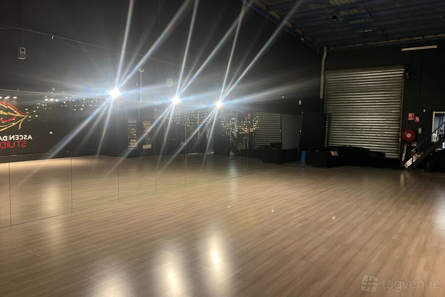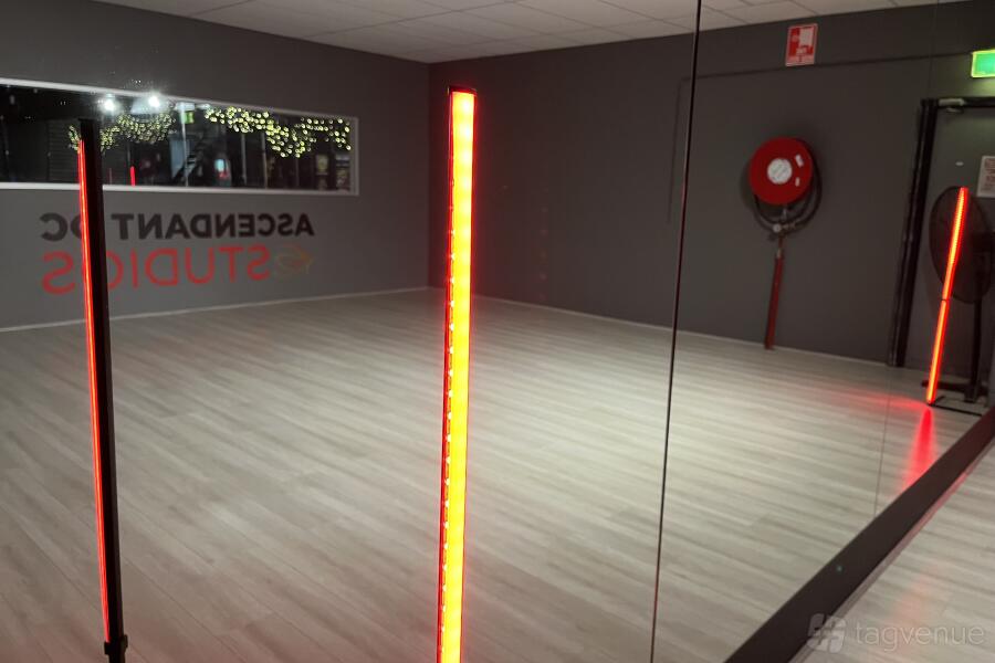 Features include: full-length mirrors, a speaker with AUX cord/Bluetooth connectivity, spotlights, two all-gender toilets, a very high ceiling, a roller door entrance for wide/high access, free onsite parking. An industrial fan is also provided.
