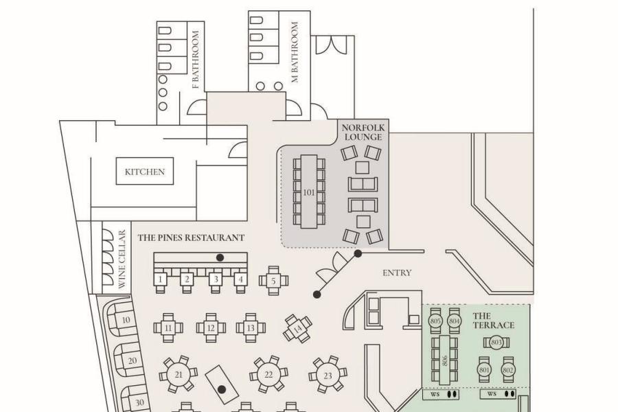 Offering three distinct areas, the Dining Room, where you can immerse yourself in the charming, open-air ambience of The Pines.