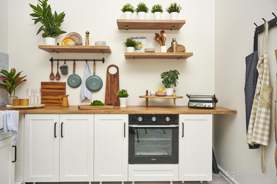 If you have seen Jamie Oliver type videos with shelves at the back and a space that can be styled, it is like this. We also have more floor space for those shooting on tables or background drops for food or product photography.