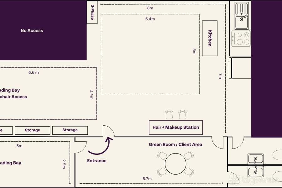 The studio provides easy access and off-street parking for two vehicles, including drive-in access via a roller door. Its modular setup allows for an adaptable space with movable backdrops, props, and furniture.