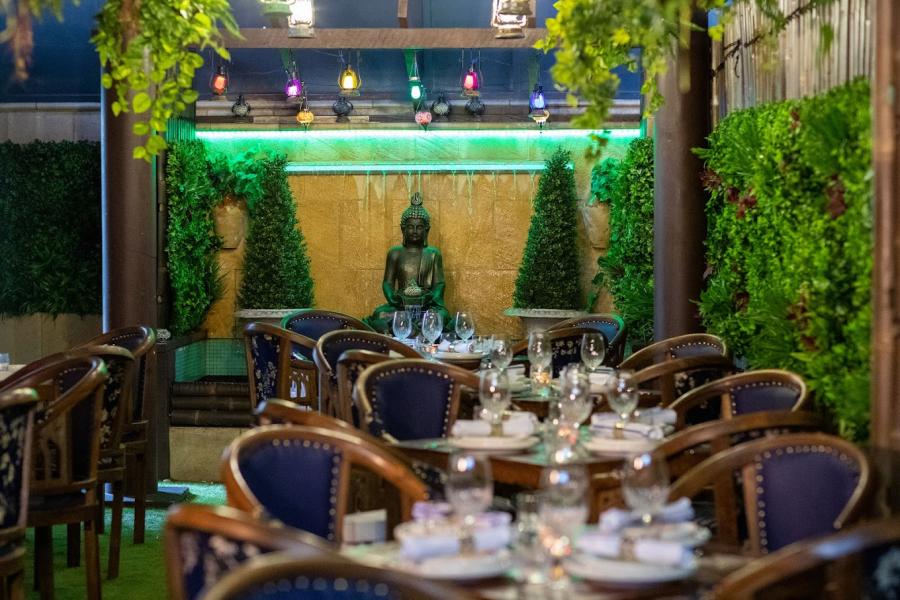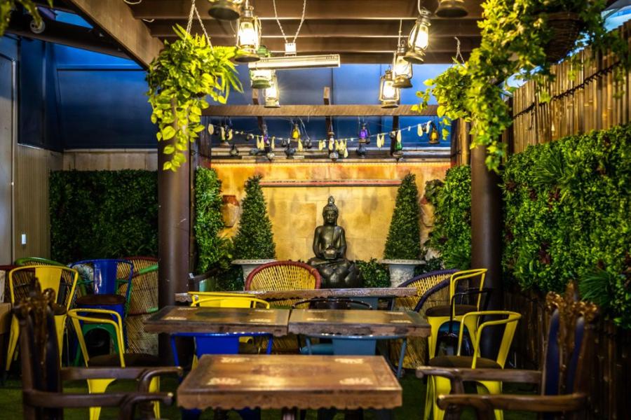 Our outdoor area, surrounded by bamboo walls and a roof, offers an intimate and refreshing atmosphere with lush plants, wooden furniture, and a wall waterfall. Colorful lamps add a warm glow to the serene setting.