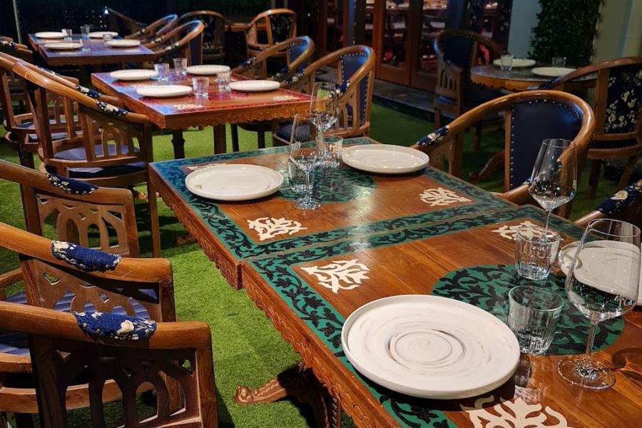 The vibrant interior features red and yellow hues, intricate decorations, and uniquely adorned chairs for a sophisticated dining experience.