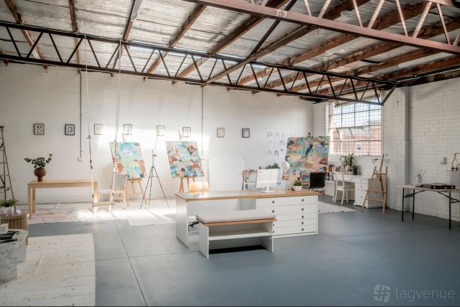A large, newly renovated warehouse with clean white brick walls and concrete floors. It’s Meg’s art studio, full of canvases and art supplies. You can use the space to do your art.