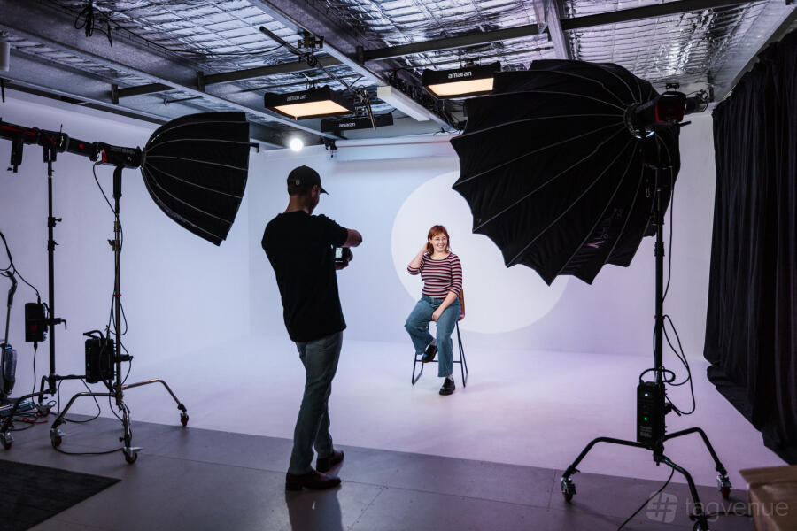 Production Studio: This 6 x 4-meter white room has a complete lighting suite, with F22c RGB lighting panels, 600D lights with 150 domes, 300C spotlights, and Aputure 60D units, to suit a variety of production requirements from laid-back headshots to full productions.