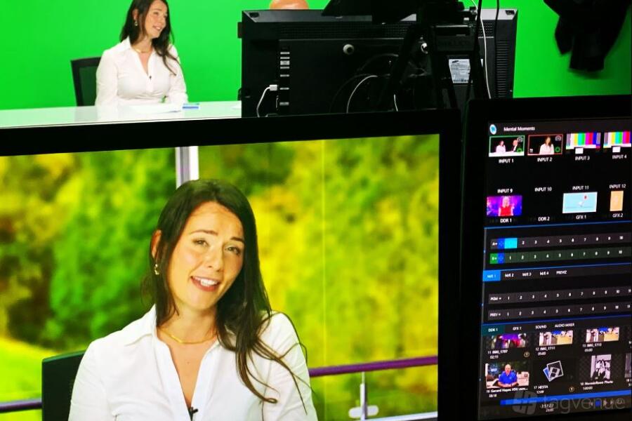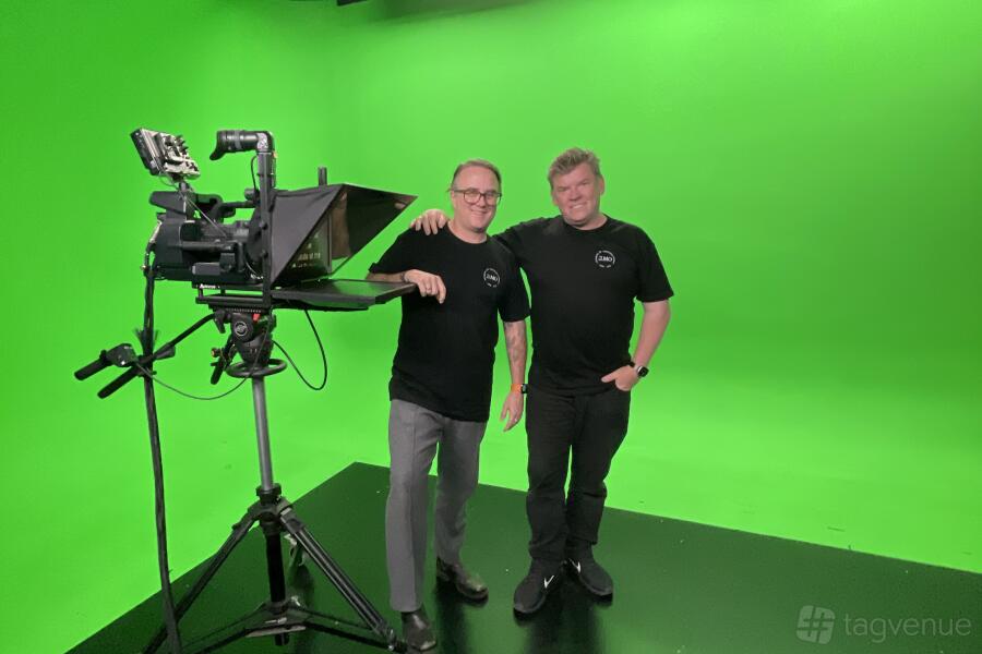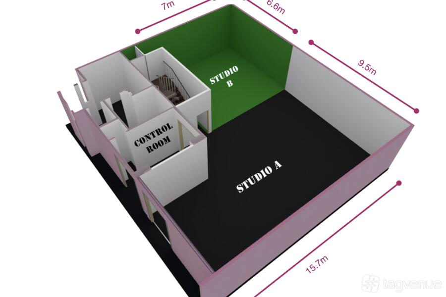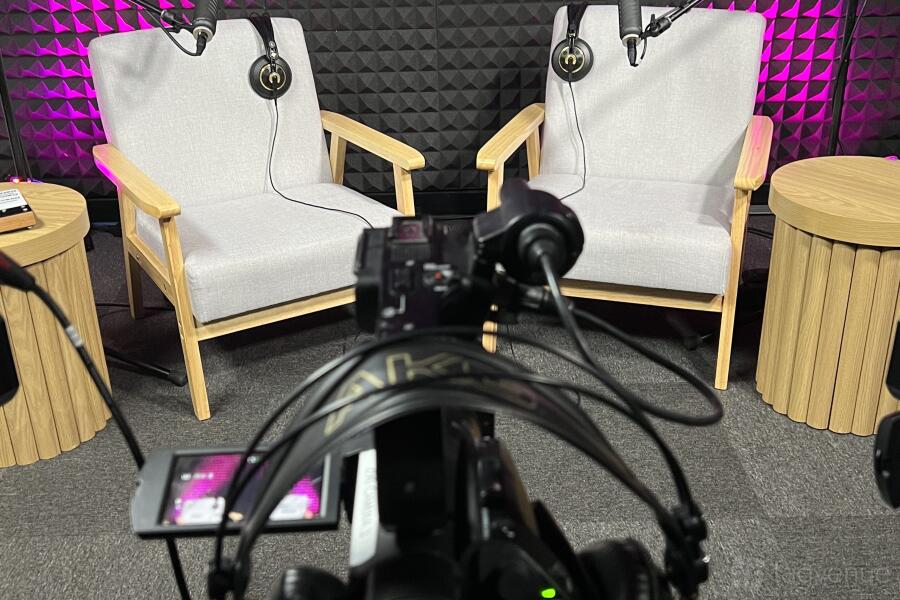 Studio B - a 50 sqm multi-purpose studio. Perfect for audio podcasts, multi-camera streaming, and green screen video recording, complete with a separate control room. Perfect for recording a podcast with 4 people, or conducting video cross-interviews with the green screen behind.