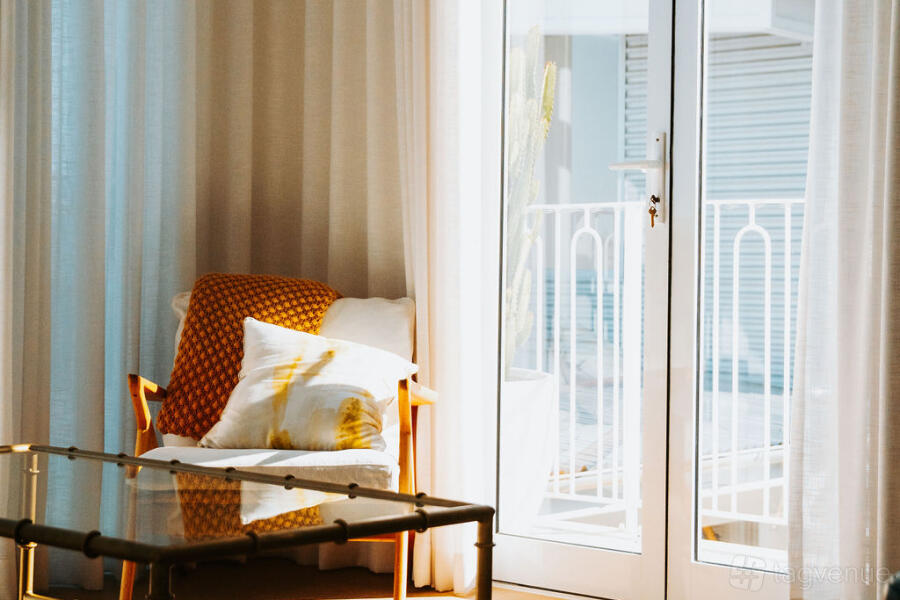 - Brisbane city views, arched doors, sheer curtains, and a pull-down bed.