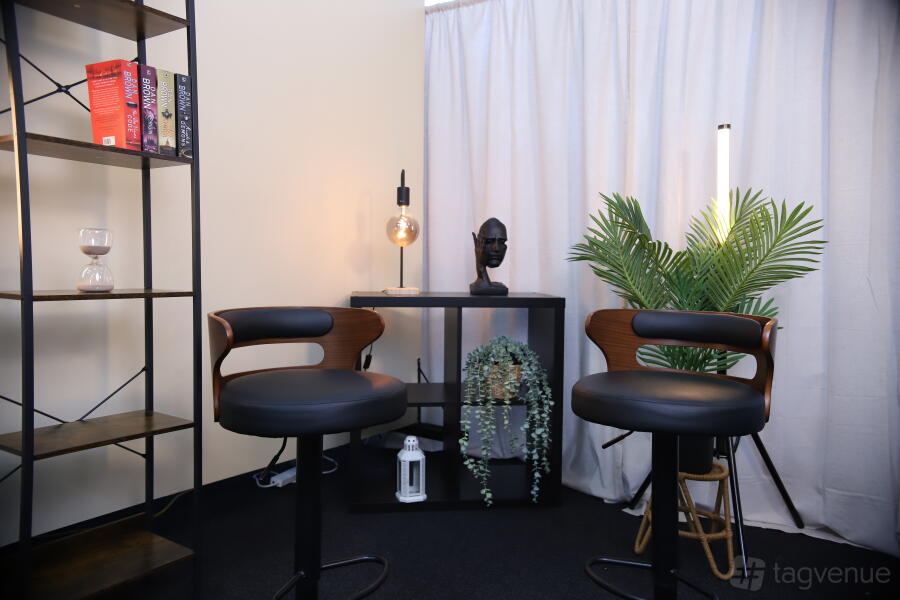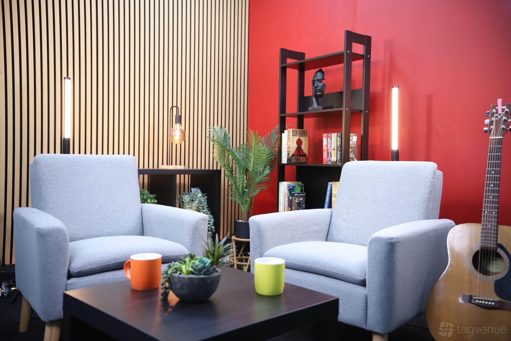 - Roomy: Comfortable, roomy podcast room ideal for Solo, Couple or group podcasting.