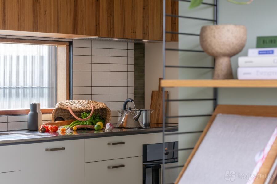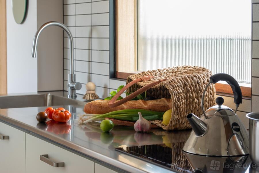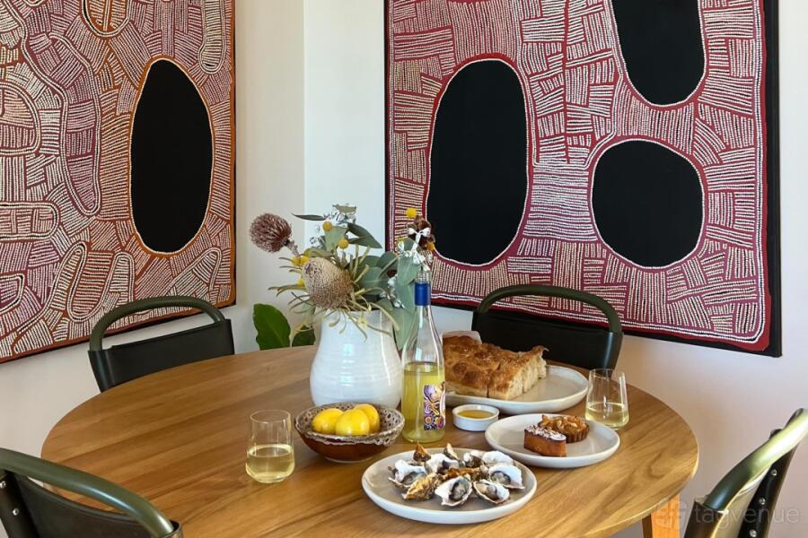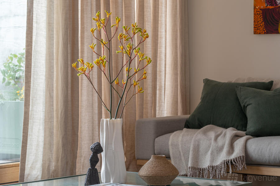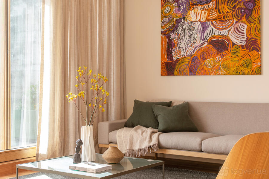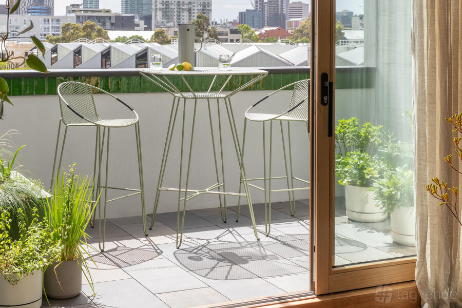The apartment offers stunning views of the city and South Melbourne Market. It includes a designated work area with high-speed internet and a fully appointed kitchen. Guests also have access to a shared rooftop yard.