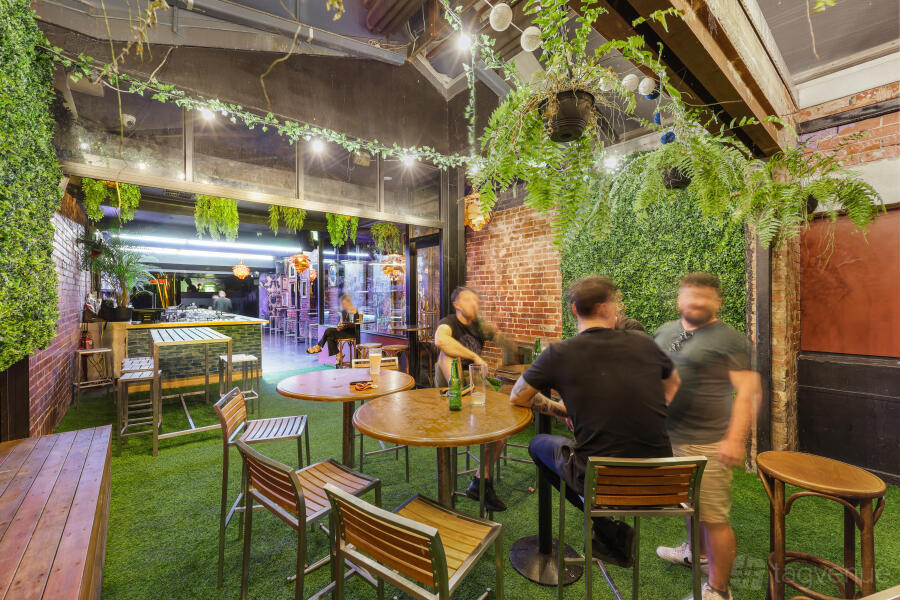As you ascend the staircase through the secret bookshelf, you'll be transported to the secret garden bar above, a hidden gem where cocktails reign supreme by day, surrounded by greenery and a retractable roof. But as night falls the atmosphere transforms into a pulsating nightclub.