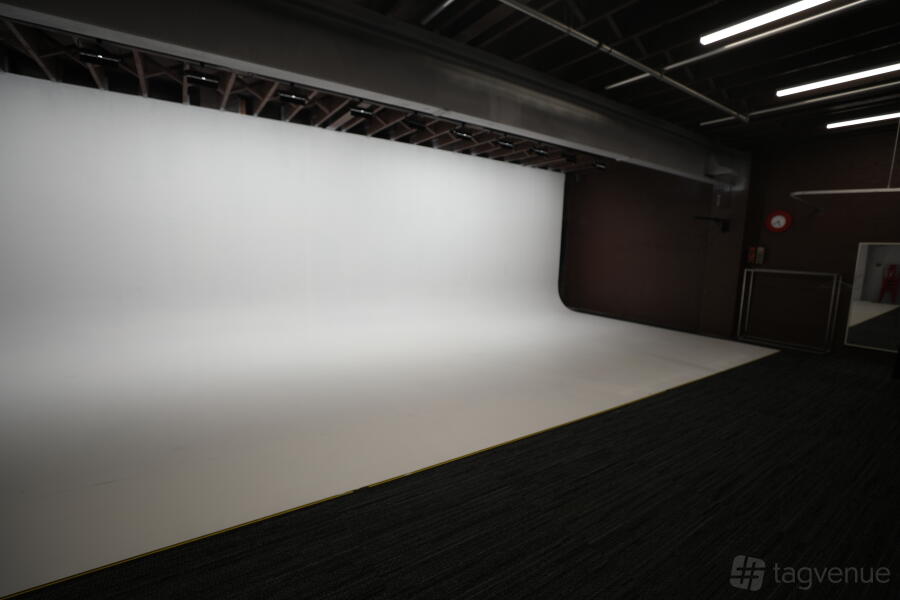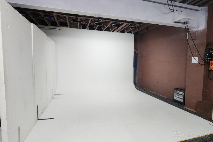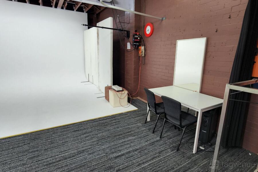 The studio comes with Cyc lighting and floodlighting for basic lighting. Carpeted floors along with many chairs and a few tables.