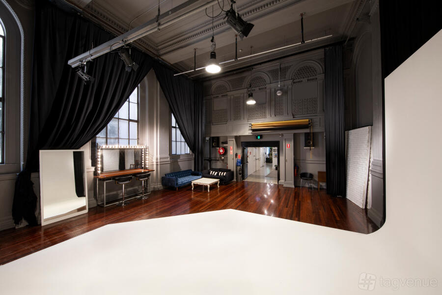 6m x 7m corner cyclorama, 3.5m high with 7m ceilings, within a 100sqm room
