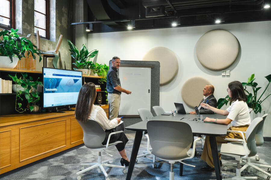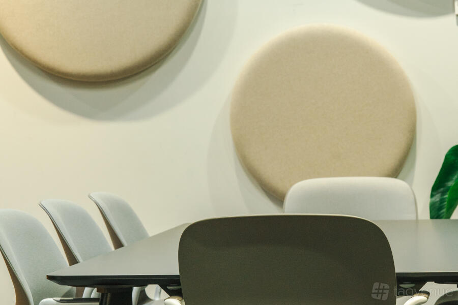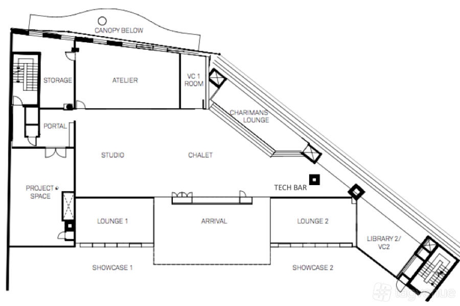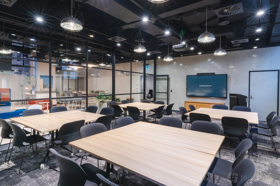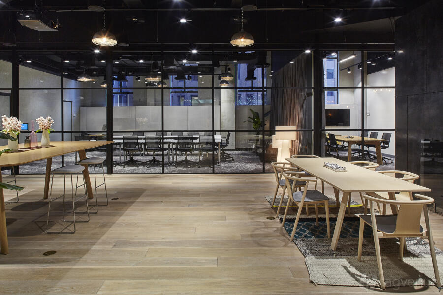 The space entails two meeting rooms and one conference room located around a centralized studio space that also couples as an event space after business hours.