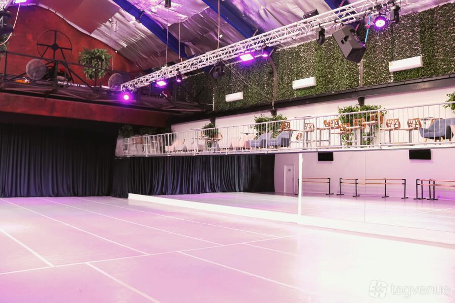 Studio A (260 sqm) features 12m ceilings, sprung hardwood floors (with Tarkett option), full lighting and AV rig, four 65” TVs, LED screen, 80 sqm mezzanine, and 50 sqm backstage area.