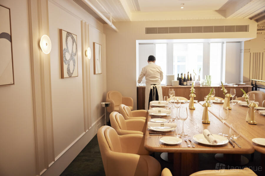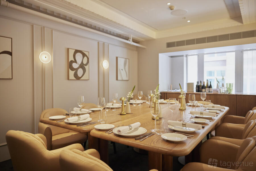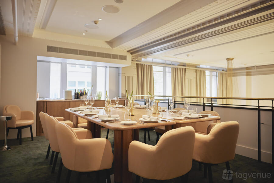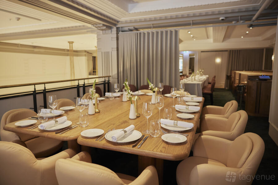 The Mezzanine allows for a range of seating arrangements. You can host up to 30 guests on separate tables, creating an atmosphere of shared exclusivity. Alternatively, opt for one long banquet table that comfortably seats 18 guests, encouraging a more intimate and communal dining experience.