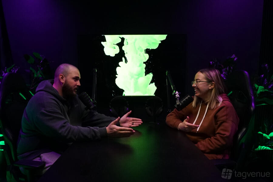 STUDIO C - our 'Minimalist & Clean' podcast/interview studio on level 1. Equipped with RØDE Pod Mics, RØDE Mic Stands, a 55 inch LCD 4K TV, studio lighting and room for up to 4 people. Just walk in, sit down, and get talking.