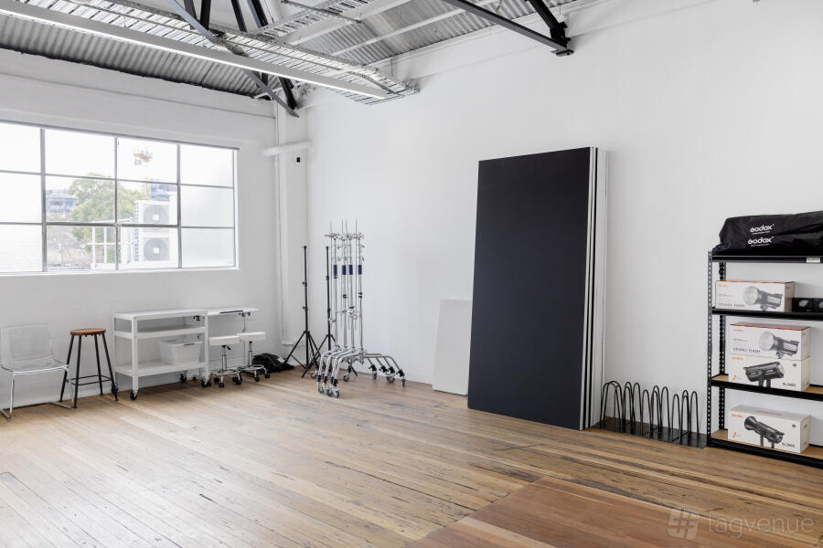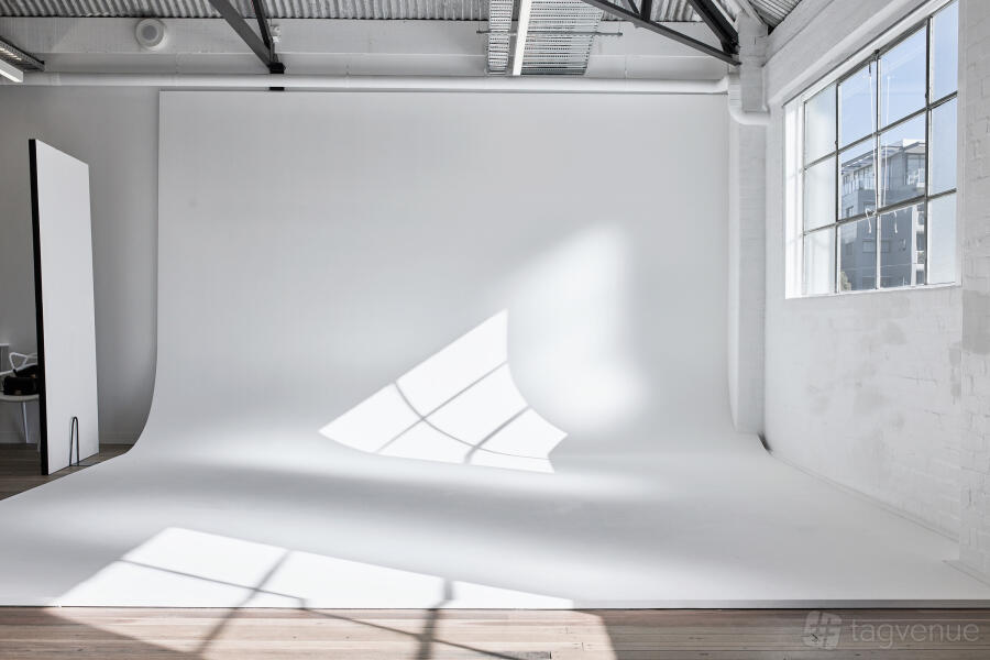 The studio features a 5m x 5m Cyclorama wall, natural light with blackout blinds. It has a white, minimalist interior that can accommodate different setups for creative projects, including campaigns, e-commerce, fashion editorials, portraits, and workshops.