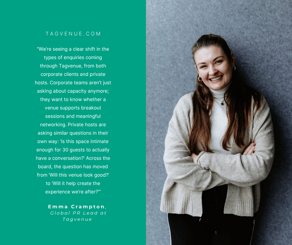 Emma Crampton, Global PR Lead at Tagvenue, sees this reflected in booking patterns across the platform, from corporate offsites to private celebrations: