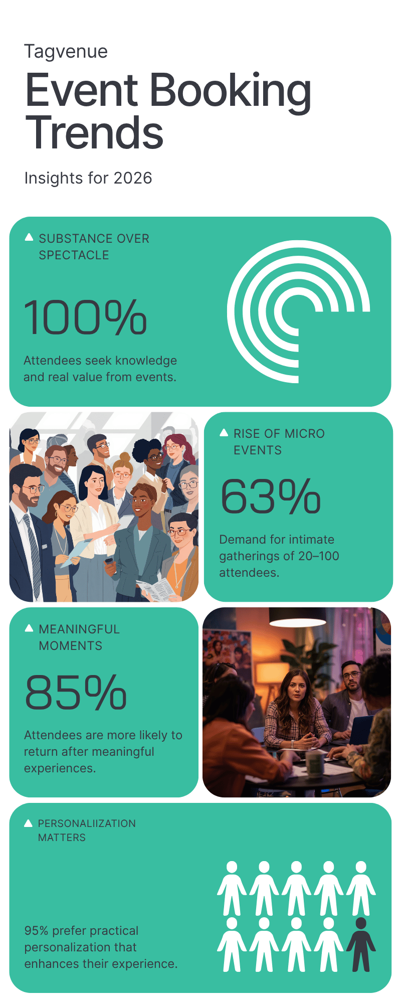 Large-scale conferences are not disappearing, but smaller, more focused event formats are playing an increasingly important role in 2026. According to Hilton’s industry outlook, 63% of planners are seeing rising demand for intimate events of 20–100 attendees that prioritize deeper engagement over sheer numbers.