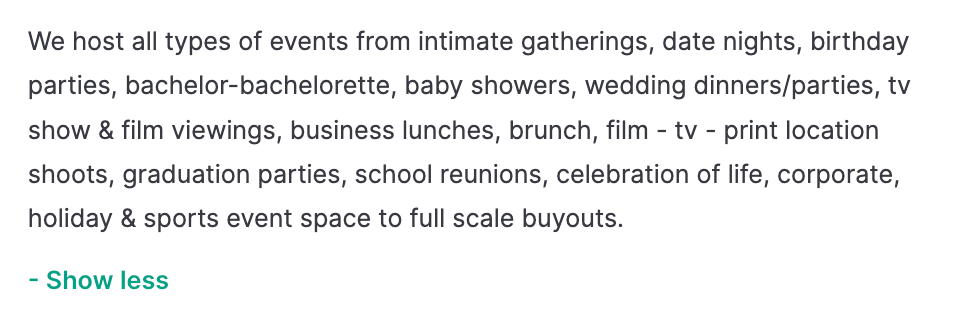 Category placement is only part of the equation. How clearly you communicate versatility in your description matters just as much. Clearly stating the types of events your venue can host helps search engines understand your space and helps potential clients immediately recognise its relevance. If they don’t see their event reflected in your description, they’re less likely to enquire, even if your venue is a perfect fit. A clear example of this approach: