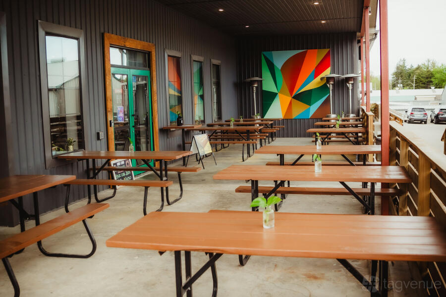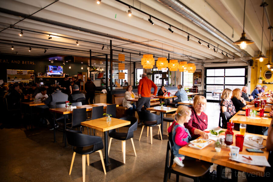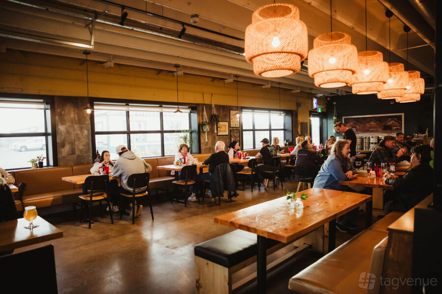 Our Main Dining Room features an open, industrial-chic design with brewery tanks, cozy booths, communal tables, and large windows that flood the space with natural light. The lively atmosphere is perfect for seated dinners, mingling, and toasting to special moments.