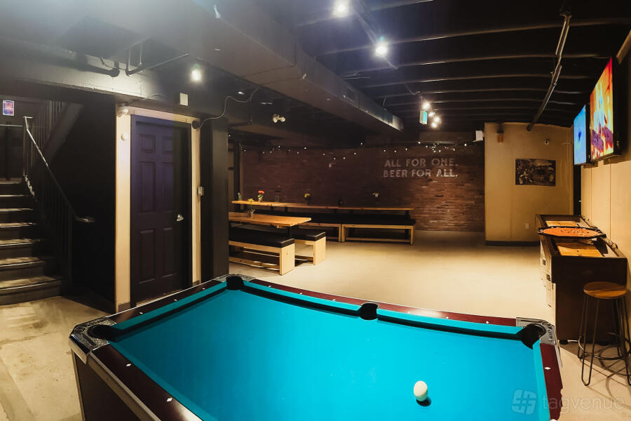 The room features a stylish industrial design with exposed brick walls, warm wooden accents, and soft string lighting that creates a relaxed and welcoming atmosphere. Entertainment is built right in with a full-sized pool table, foosball, dartboards, and multiple TVs, ensuring your guests stay engaged and entertained throughout the event. Flexible seating options include tables, benches, and high-top counters, making it easy to customize the layout to suit your needs.