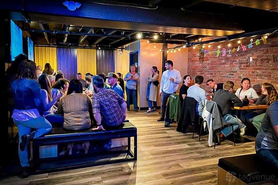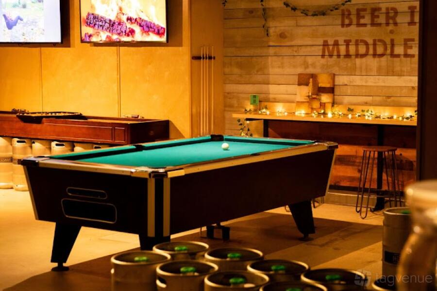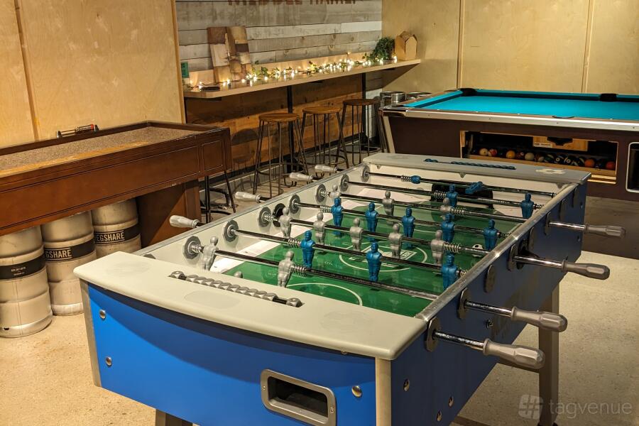 The lower level offers a relaxed, entertainment-focused vibe. Highlights include exposed brick, wood accents, a pool table, foosball, dartboards, and multiple TVs-perfect for unwinding or interactive gatherings.