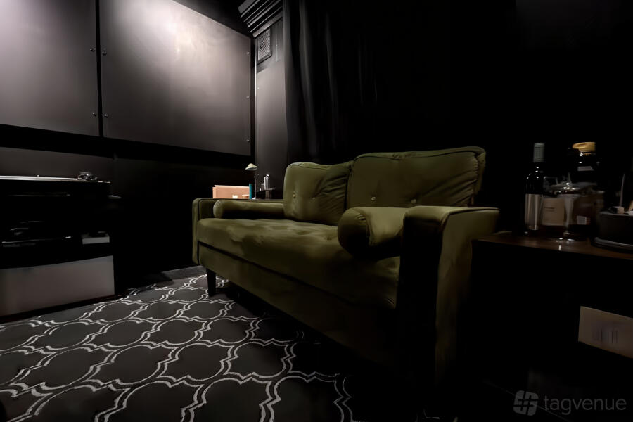 Features include heated ceramic flooring, LED ambiance and stage lighting, optional curtains, stage, and backdrop. A built-in bar can serve up to 44 guests, with a snack bar also available. The room also offers Bluetooth/USB/SIM-compatible audio playback, coat check, and full AV equipment upon request. Flexible setups make it perfect for small performances, private parties, karaoke, podcast recordings, or creative workshops.