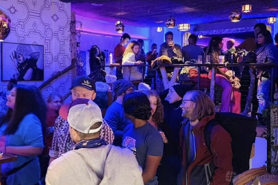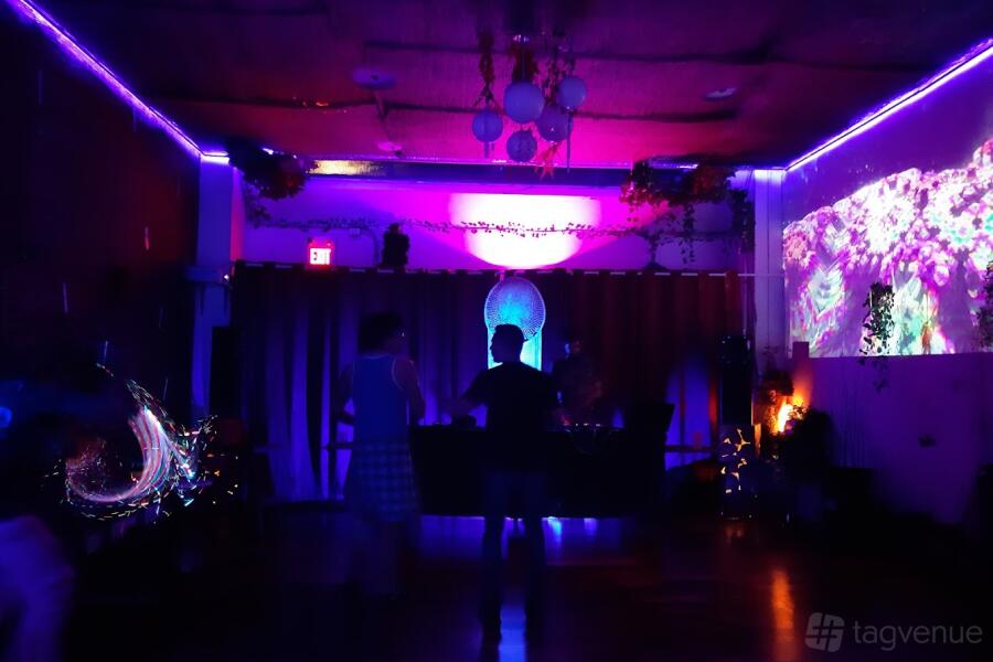 This room is situated within a café and offers the convenience of having food and drinks available for purchase. It spans 400 square feet with a 12-foot ceiling and features hardwood flooring, ample sunlight, and a back door access for loading. The lights in the room are dimmable, and there are color LED lights to create a customizable ambiance.