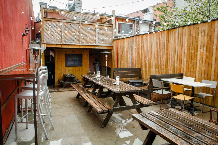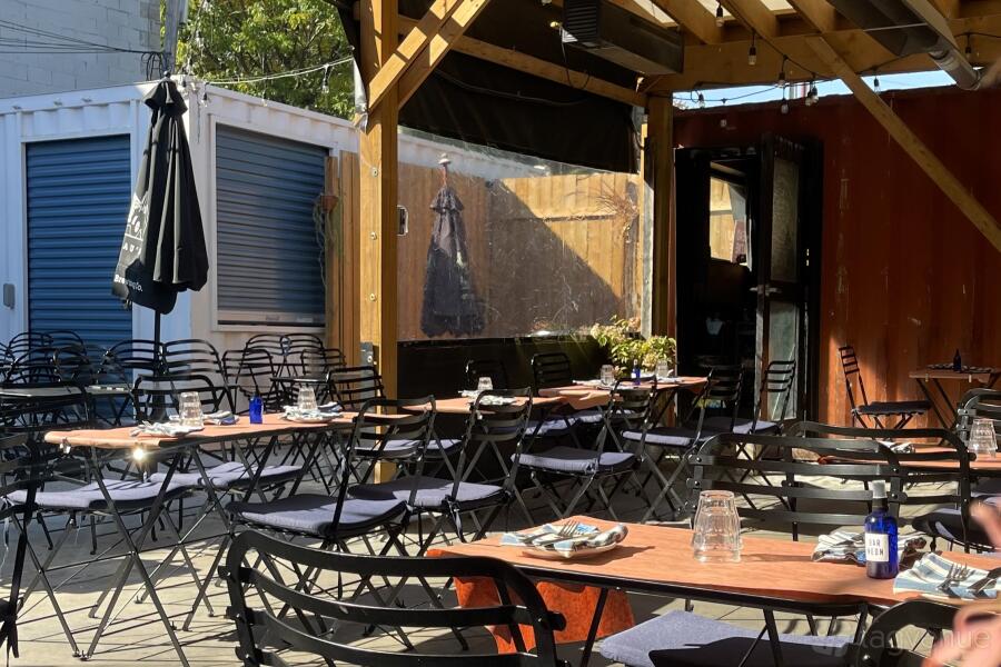 The indoor dining room has a full-service bar and a selection of high and low tables. The space has a capacity limit of 60 and is equipped to accommodate 30 seated guests.