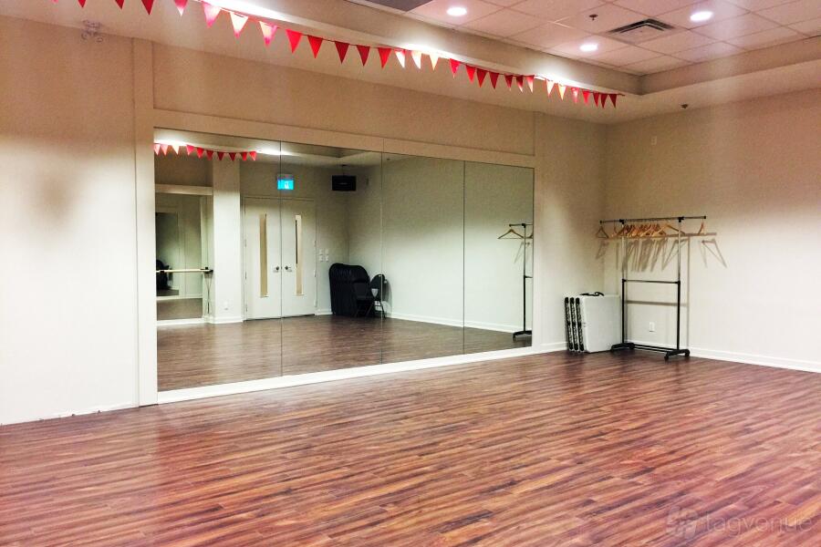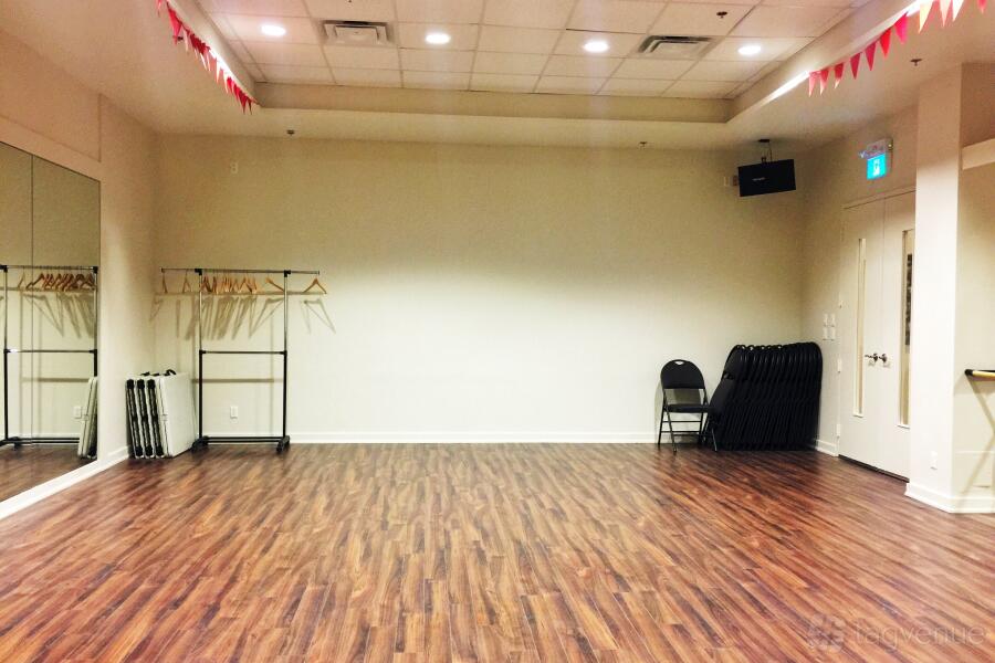 Welcome to our captivating performance space, a versatile setting for artistic expression that can accommodate up to 100 guests. With an open ceiling with overhead stage lights, two mirrored walls framed by blackout curtains, and dark wood floors, this intimate yet spacious environment sets the stage for unforgettable performances.