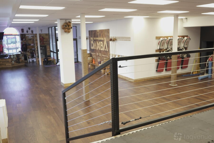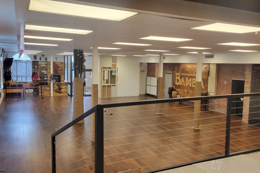 A second mezzanine level with removable railing doubles as a large, 1000 square foot stage with matted floors, mirrors, some weight equipment and RBG ceiling lights.