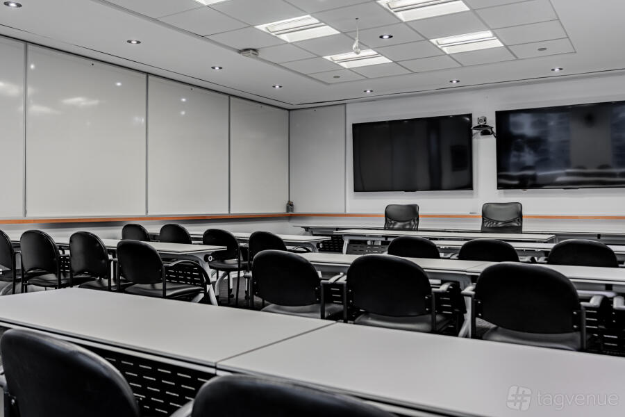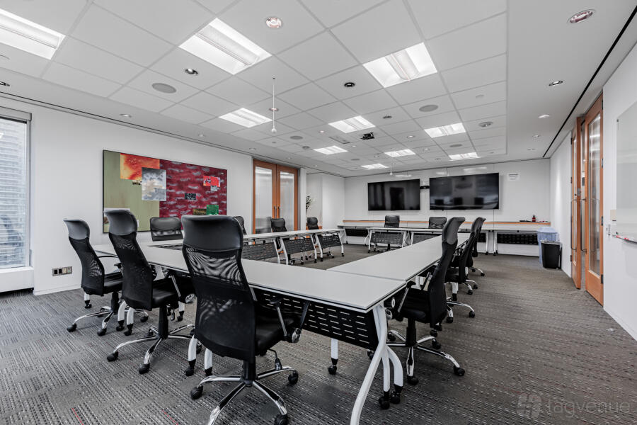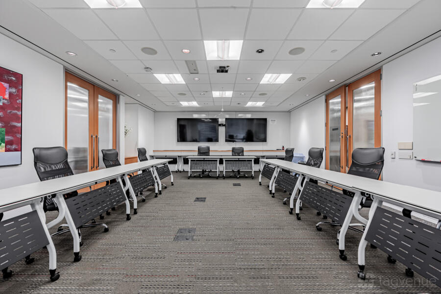 Included in this space is: tables, chairs, customizable room layouts, wifi, OLED TVs for presentation, hybrid meeting technology, complementary water, and catering available.