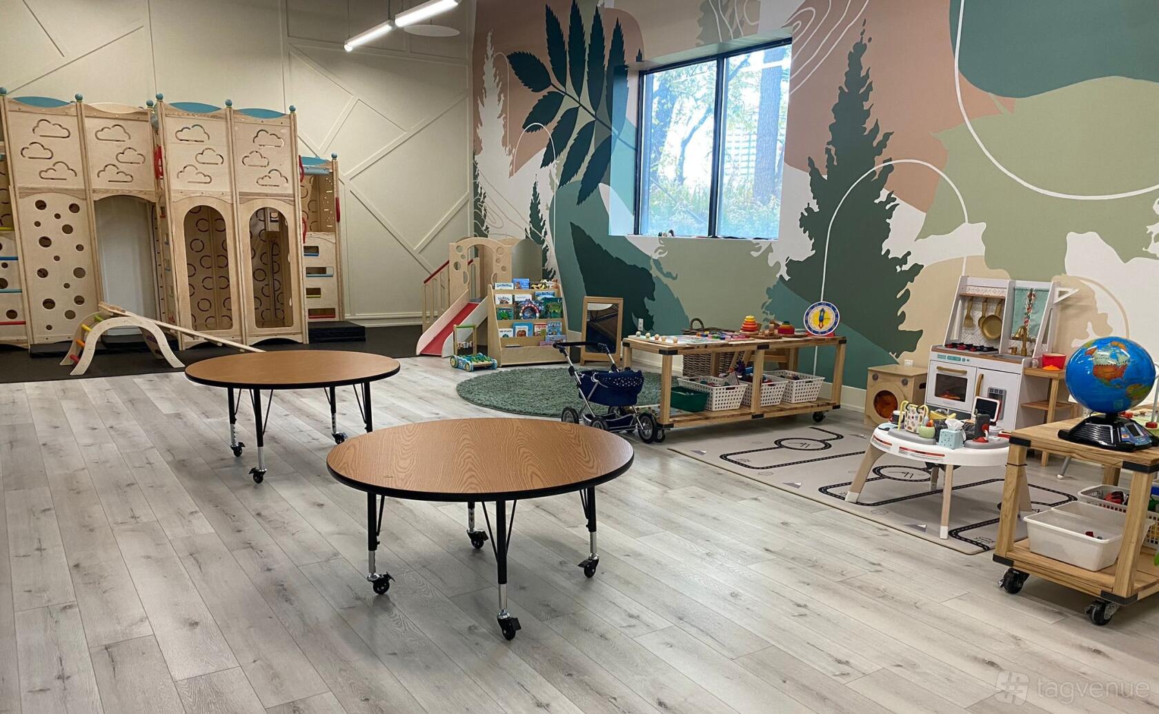The Play Room at Thrive Hive Studio is a vibrant and engaging space designed to spark creativity and joy. With its bright, nature-themed mural, large windows allowing natural light, and colorful play structures, the room creates a lively and inviting atmosphere. The light wood flooring and organized play areas are perfect for children to explore and enjoy various activities in a safe and stimulating environment.
