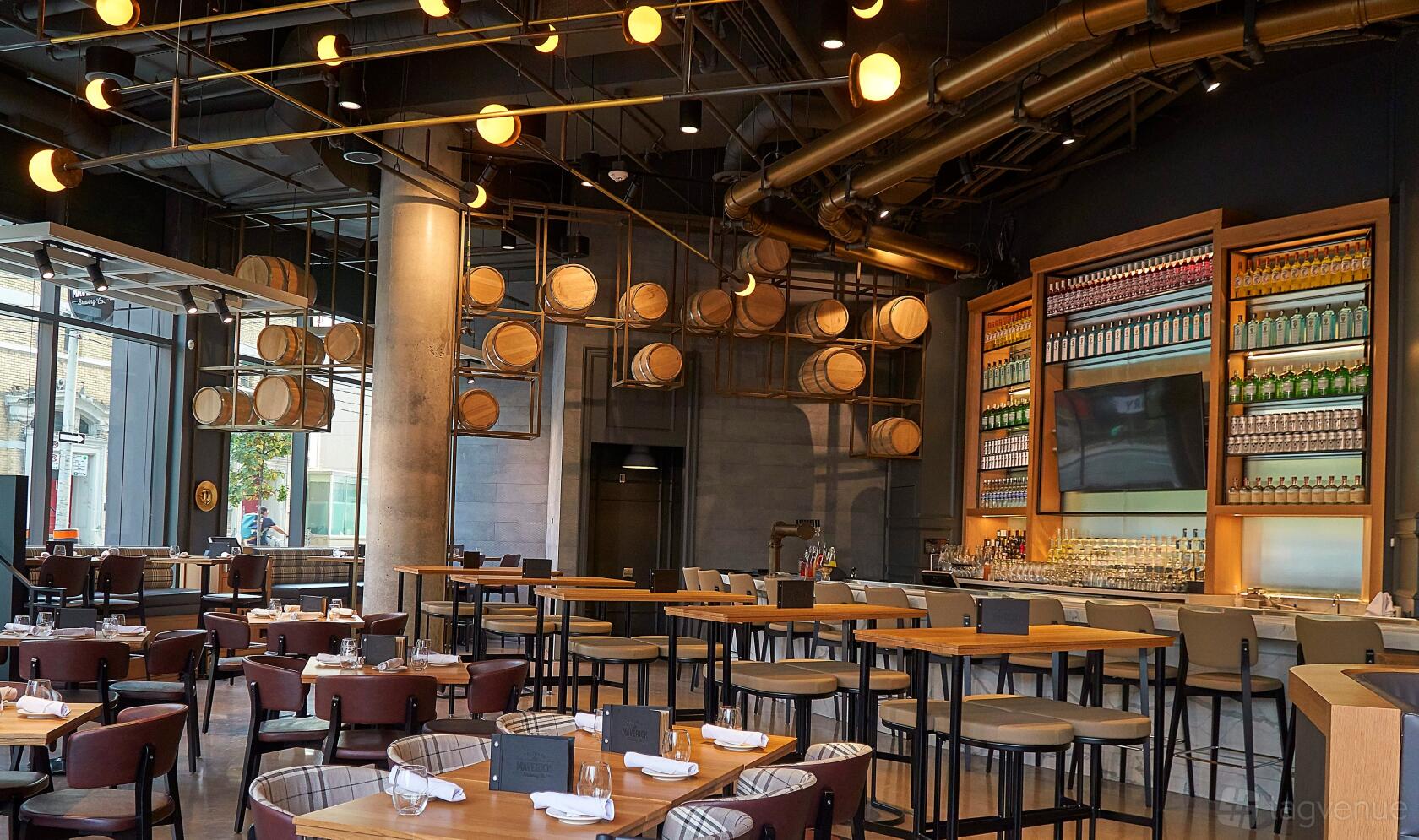 Our open concept dining room has a modern and stylish look. The space features hanging barrel decorations, exposed pipes, and an open layout with a variety of seating options including booths and high stools. The bar is equipped with multiple large screens and a well-stocked bar area, making it ideal for social gatherings and watching sports. The atmosphere is both trendy and welcoming.