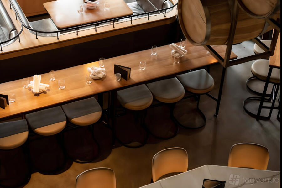 The overall decor is contemporary, with artwork and clean lines creating a modern setting perfect for an intimate dining experience or a mix-and-mingle social event.