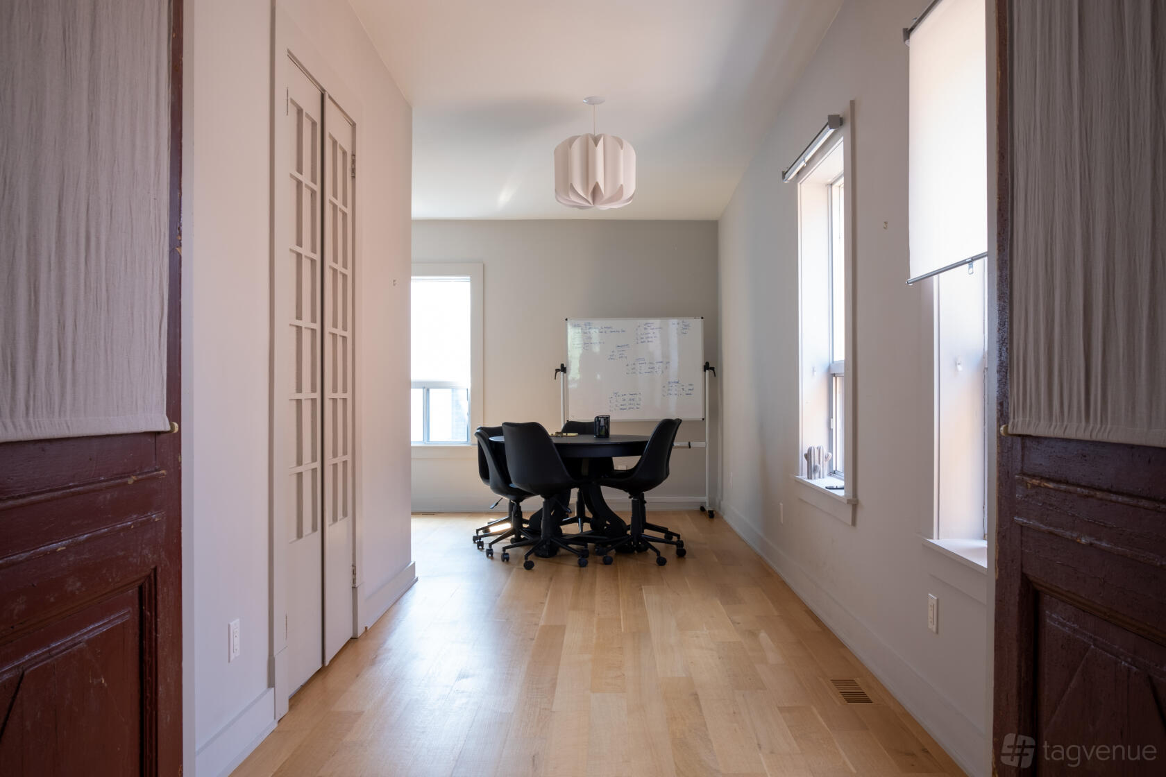 Spacious meeting room on the top flow of the building filled with light. The room has its own private washroom, conference call facilities available, as well as a whiteboard and access to a shared kitchen with complimentary coffee and tea available through the day.
