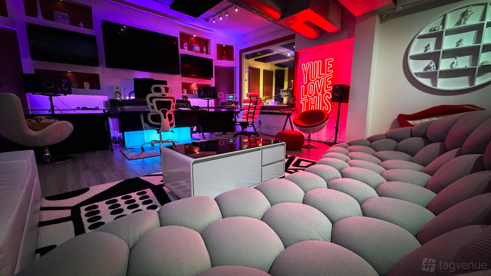We are a fully equipped 2,500 sq/ft recording studio and event space designed for creating unique content. The studio can accommodate up to 100 people. It's perfect for events, photoshoots, video production, music recording, podcasts, and more. It also features advanced DMX lighting, moving heads, and a professional projector to meet all your creative needs.