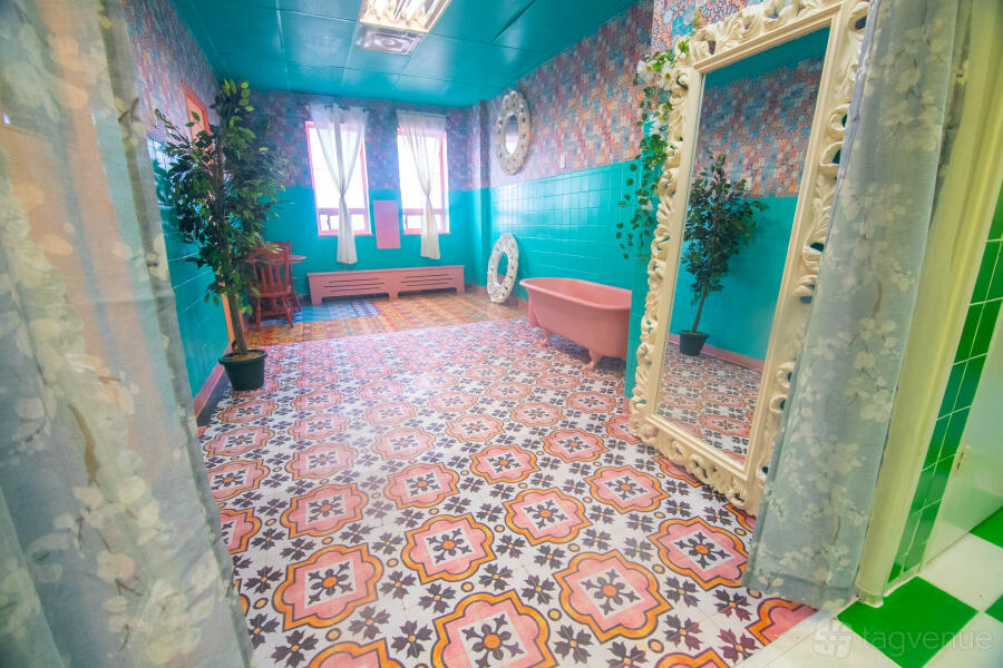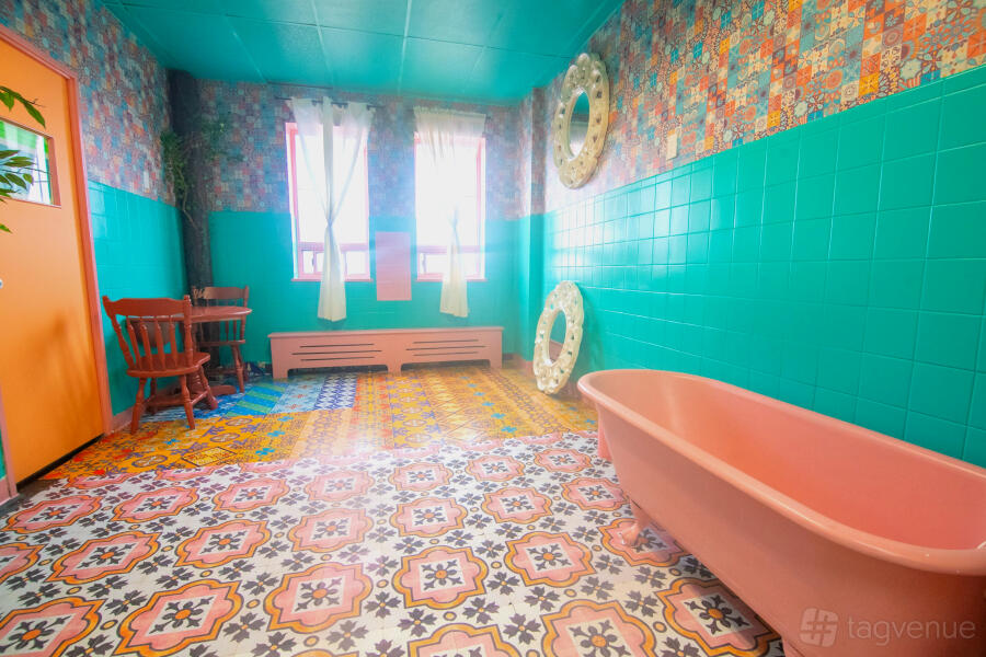 Maison Film Studios is a photography and film studio in Toronto that has a spacious and versatile setting with multiple themed sets. The space includes decor elements like velvet couches, vintage furniture, a pink claw tub, and colorful wallpaper. With a fully equipped kitchen, vanity station, backdrops, lighting, and a smoke machine, the studio is great for creative productions, photoshoots, and filming.