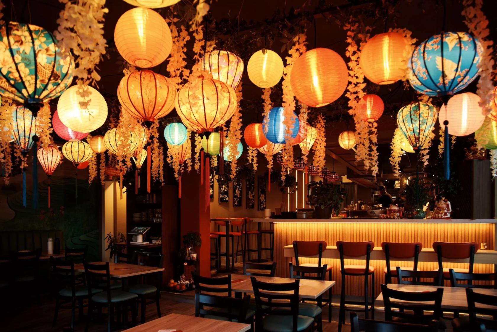 This dining space is decorated with lantern lighting, wood tables, and cascading floral decor. The mood is cheerful and calm.
