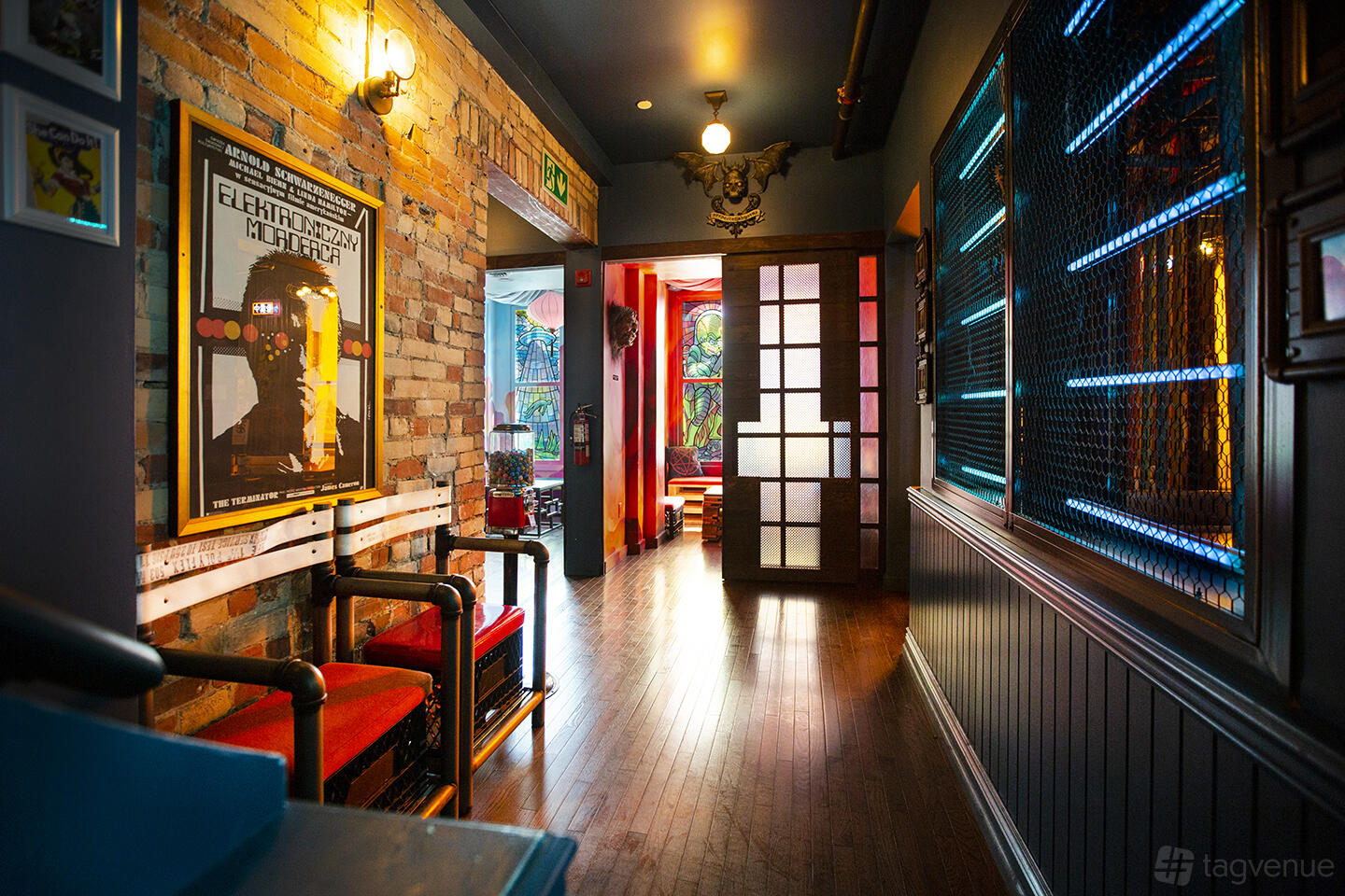 Toronto's geekiest bar! Opened in late 2018 in an elegant Church St mansion, it includes a sanity-shattering array of theme rooms, secret doors, catacombs, cyberpunk bars, glowing, bubbling cocktails, randomly-generated burgers and, oh yeah, tentacles.