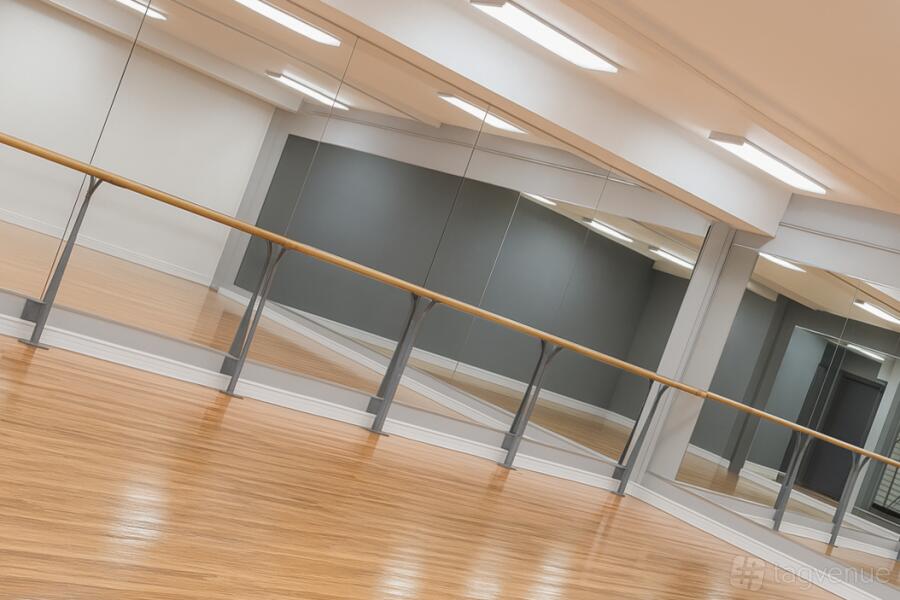 Located in a sleek two-storey building, this ballet school offers bright, spacious studios lined with wall-to-wall mirrors and sturdy barres. Large windows flood the space with natural light, enhancing the clean, professional vibe.