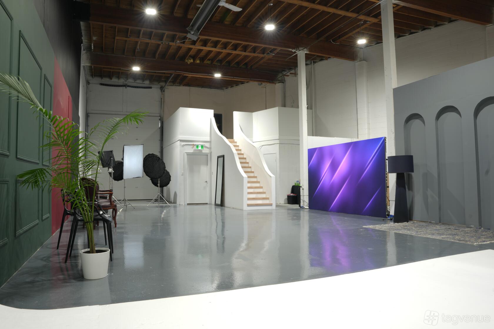 The Vanco Event studio in North Vancouver is designed for photography and videography with various layouts and designs, professionally set up with a ceiling height of approximately 20 feet.