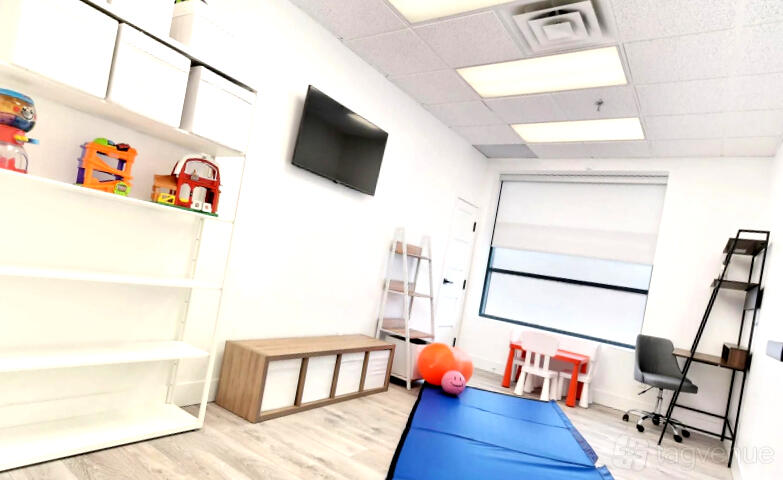 This room includes a desk and chair, perfect for office work or Zoom meetings. There is also a TV screen, a child size table and chairs, and a large gym mat. The floor space can be used for thai massage, physiotherapy, personal training or small group fitness.